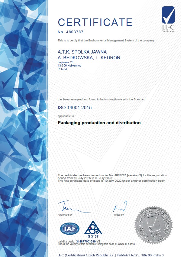 A.T.K. Spółka Jawna A. Będkowska, T. Kędroń, based in Kobiernice, Poland, has obtained the ISO 14001:2015 certificate, confirming the implementation and use of an Environmental Management System in the area of packaging production and distribution. The certificate is valid until July 2028 and was issued by the certification body LL-C (Certification).