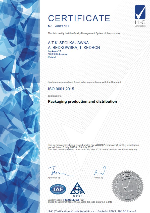 A.T.K. Spółka Jawna A. Będkowska, T. Kędroń, located in Kobiernice, Poland, holds a valid ISO 9001:2015 certificate confirming the implementation and use of a Quality Management System in the scope of packaging production and distribution. The certification was issued by the independent certification body LL-C (Certification) and is valid until July 2028.